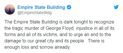 刚刚,纽约帝国大厦在其官方推特账号上发布消息称,帝国大厦当地时间6月1日晚熄灯,以回应乔治·弗洛伊德被“悲剧性谋杀”,以及“一切形式的不公正及其所有的受害者”。