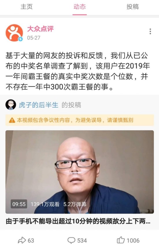 在网友质疑后,UP主“虎子的后半生”发视频承认大众点评上的账号是自己的。“关于有人在大众点评上说我又吃海鲜又吃火锅,我也不否认,我也不能没有自己的生活。家里人怕影响我情绪,怕我生气,帮我把大众点评的号给删了。”随后该UP主又将此视频删除。