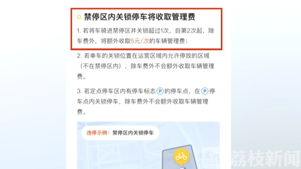 美团交通政府事务部江苏负责人文艺介绍说,目前在禁停区里面停车,试点阶段用户会收到短信提醒。“后期的话,我们会上线一个罚款的举措。”