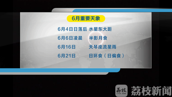 此外,6月还将有多个重要天象。6月6日凌晨,全国可见半影月食。6月16日,天琴座流星雨"绽放"夜空。6月21日,6月最重要的天象日环食将震撼登场。江苏省虽然不在还食带上,但全省可以见到日偏食。在6月21日14点40或50分之后一直到17点,都可以看到日偏食。