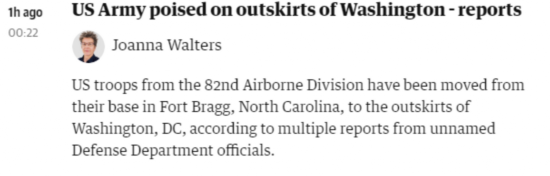 此外,《卫报》还援引美联社消息称,两名不具名美国防部官员称,另有1400多名士兵也可在1小时内做好动员准备。报道称,这些士兵全副武装,并且戴有防暴装备及枪刺(bayonets)。