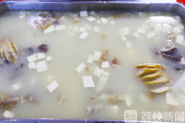 6月1号中午,大鱼宴正式开席。今年的菜品是红烧鱼块和鱼头豆腐汤,全校一万两千名师生在校内各个食堂免费领取一份套餐。大鱼宴从中午11点开始,实行错峰进餐,但仍有不少学生提前20分钟到达食堂排队。