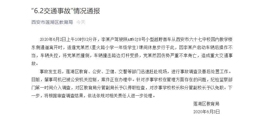 事故发生后,莲湖区教育、公安、卫健、交警等部门迅速赶赴现场,进行事故调查及善后处置工作。目前,肇事司机已被公安机关控制,案件正在办理中。针对涉事学校在管理方面存在的问题,纪检监察部门第一时间介入调查,对区教育局分管副局长予以停职检查,对涉事学校校长和分管副校长予以免职。下一步,将根据审查调查结果,依法依规对相关责任人进一步处理。