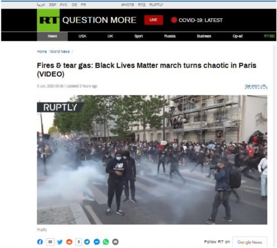 “今日俄罗斯”(RT)3日报道称,2日晚,数百名抗议者无视疫情禁令,走上法国首都巴黎的街头,声援美国抗议者,并要求为本国遭受警察“暴行”的受害者讨回公道。