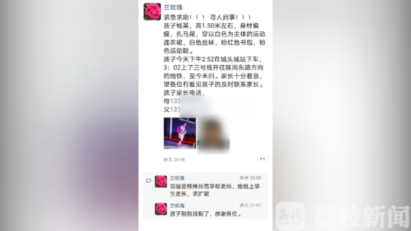 女孩母亲杨女士说:“因为当天我要接不同学校的两个小孩,所以我提前到她学校把她接出来,一起上了公交车。中途我下车去接另一个小孩,让她自己回家了。等我到家发现她没回来,就立即意识到她丢了。”考虑到孩子是唐氏儿,家人赶忙报了警,还联系了学校老师,大伙儿一起寻找,不少知情人也利用朋友圈、微信群发布寻人消息。