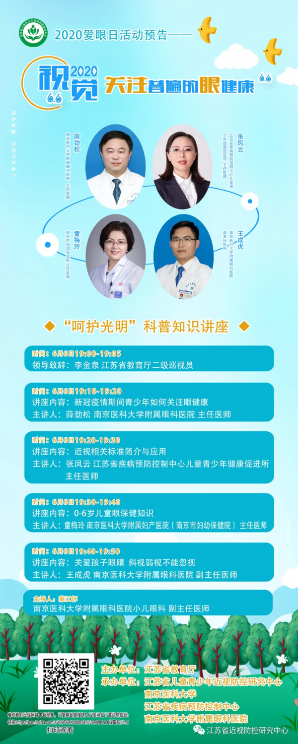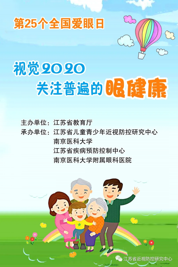 我苏网讯 2020年6月6日是第25个全国爱眼日,为大力宣传眼健康工作进展和成效,普及儿童青少年近视、老年白内障、糖尿病视网膜病变、青光眼等眼病防治知识,由江苏省教育厅主办,江苏省儿童青少年近视防控研究中心、南京医科大学、江苏省疾病预防控制中心、南京医科大学附属眼科医院共同承办爱眼日系列活动。