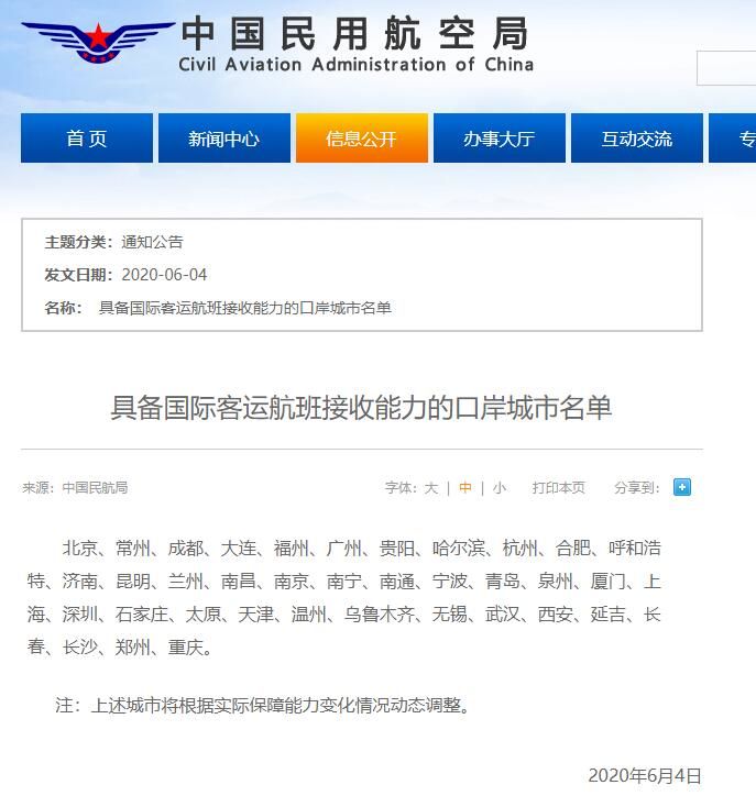 荔枝新闻讯 6月4日,中国民航局公布具备国际客运航班接收能力的口岸城市名单,具体口岸城市名单如下: