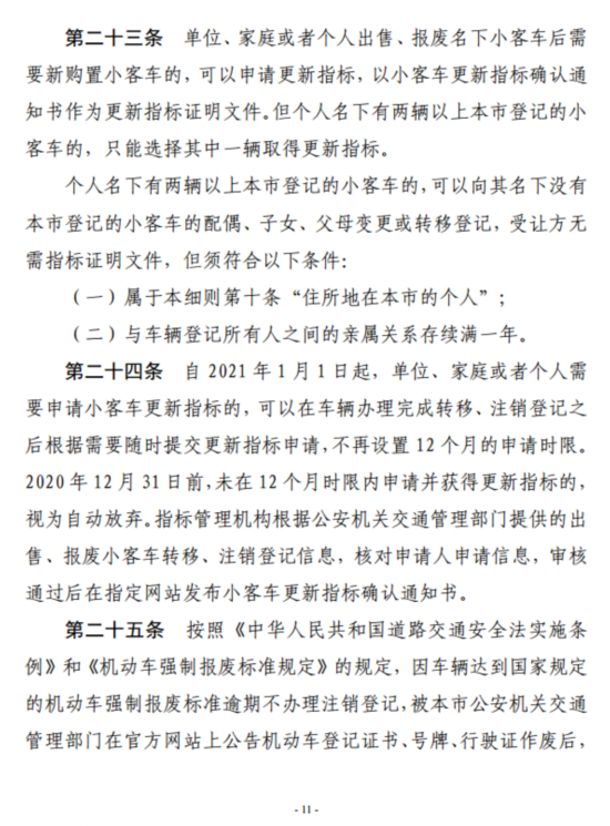 二是增加对个人申请更新指标数量的限制,并配套放开名下多车的个人向符合条件的近亲属转移登记车辆。具体来说,就是每人最多只能保留1个小客车指标。1人名下如果拥有多辆在本市登记的小客车的,车辆更新时可以选择其中1辆申请更新指标,其余车辆不予办理更新指标,但允许其向名下没有本市登记的小客车的配偶、子女、父母转移登记多余的车辆,受让方无需指标证明文件但要符合“住所地在本市的个人”的条件。