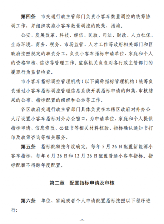 第二条 本市实施小客车数量调控措施。小客车年度增长数量和配置比例由市交通行政主管部门会同市发展改革、公安交通、生态环境等相关行政主管部门,根据小客车需求状况和道路交通、停车泊位供给、环境承载能力合理确定,报市人民政府批准后向社会公布。