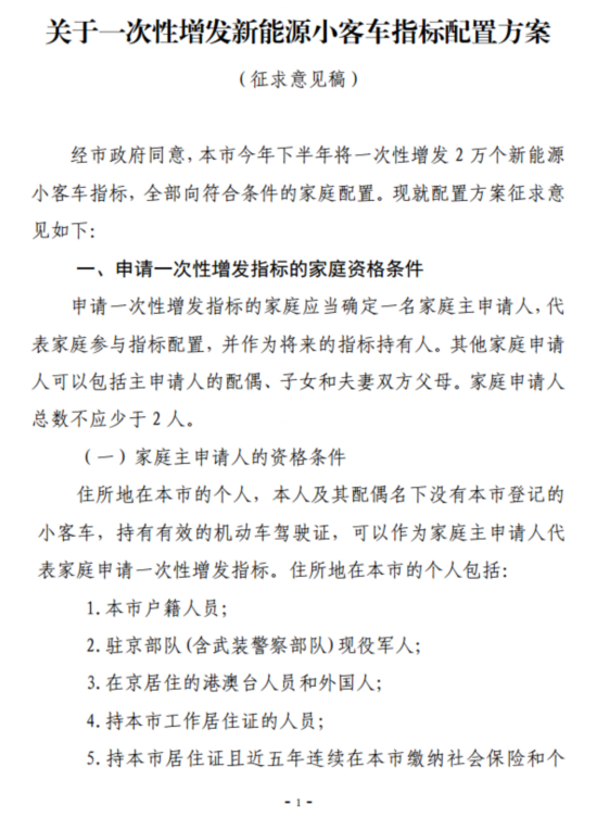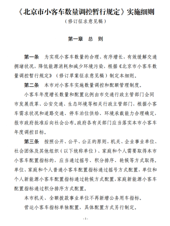 为进一步优化小客车指标配置方式,增强人民群众的获得感,本市拟对《北京市小客车数量调控暂行规定》《〈北京市小客车数量调控暂行规定〉实施细则》进行修订,现将修订稿全文公布,征求社会各界意见。同时,本市拟于今年下半年一次性增发2万个新能源小客车指标,全部向符合条件的家庭配置,有关配置方案一并公开征求意见。