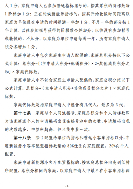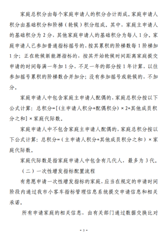 一是在以个人为单位参加普通指标摇号和新能源指标轮候配置方式的基础上,增加以“无车家庭”为单位摇号和积分排序的指标配置方式。同时,指标配置向“无车家庭”倾斜照顾,通过赋予“无车家庭”明显高于个人的普通指标摇号中签率和新能源指标配额数量,优先解决“无车家庭”群体的拥车需求。这是本次政策优化方案中最核心的内容。