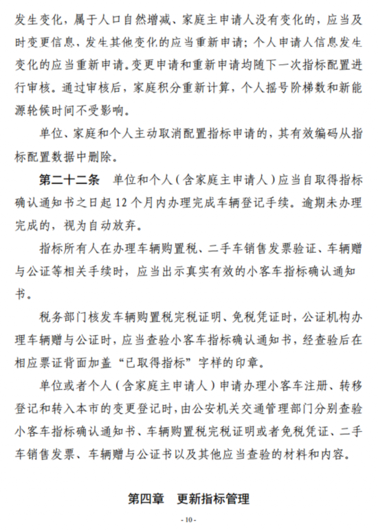 三是取消申请更新指标的时限要求。现有政策规定,单位或个人需要小客车更新指标的,应在车辆办理完成转移、注销登记之日起12个月内提交更新指标申请,逾期未申请的视为自动放弃。从这些年的施行情况看,一是出于个人主客观原因导致未能在规定时限内申请更新指标,对个人造成重大损失;二是许多不急于新购置车辆的个人,不得不赶在时限到期前申请更新指标,不利于实现调控政策关于放缓机动车增速的目标。因此,政策优化方案拟取消这一时限,方便单位或个人根据实际需要安排申请更新指标的时间,同时起到减少存量小客车,减轻道路拥堵、停车矛盾和生态环境压力的作用。但是,一旦申请到更新指标以后,指标有效期仍为12个月不变。