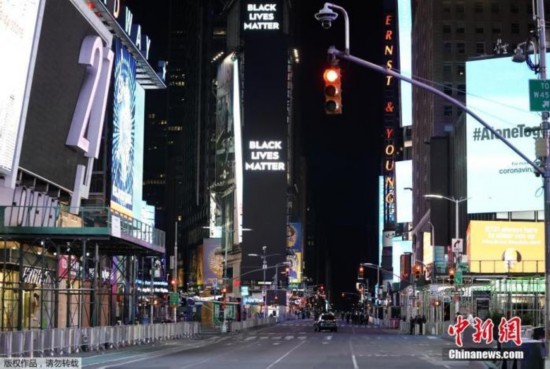 当地时间6月2日起,美国纽约的宵禁时间将有之前的晚间11点更改为每天晚8点至次日早5点,并将宵禁延长至6月7日。图为纽约警察在封闭的时代广场附近巡逻。