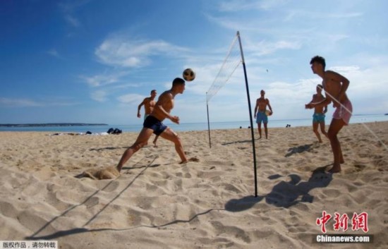 当地时间5月25日,民众在西班牙大加那利岛重新开放的海滩上玩乐休闲。图为民众在沙滩上玩网式足球。