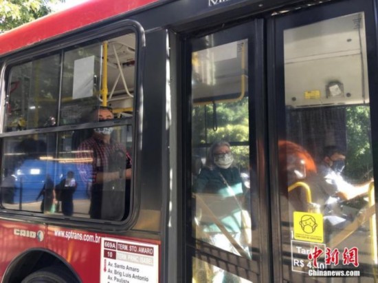 当地时间6月1日,在巴西圣保罗,民众佩戴口罩乘坐公交车。 中新社记者 莫成雄 摄
