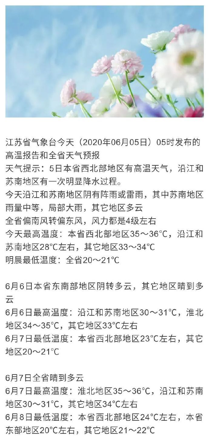 今天(6月5日)沿江和苏南地区阴有阵雨或雷雨,其中苏南地区雨量中等,局部大雨,其它地区多云,全省偏南风转偏东风,风力都是4级左右,今天最高温度:本省西北部地区35~36℃,沿江和苏南地区28℃左右,其它地区33~34℃,明晨最低温度:全省20~21℃。