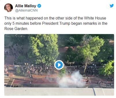 当地时间6月1日,美国总统特朗普在白宫发表演讲后,步行前往附近的圣约翰教堂。据多家媒体报道,为了给特朗普“开道”,白宫周边的警察使用催泪瓦斯、闪光弹和橡皮弹将白宫外的和平抗议者们驱散。此事在美国引发极大争议。