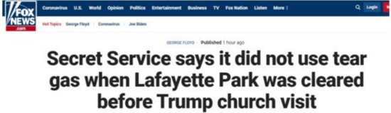 据美国福克斯新闻网4日报道,美国特勤局发言人于3日表示:“特勤局已经确定,2020年6月1日(星期一),在维护拉斐特公园附近地区的安全秩序时,没有执法机构人员使用催泪瓦斯或胡椒喷雾。” 此外,特朗普在当天接受该媒体采访时也说,警察们没有使用催泪瓦斯。
