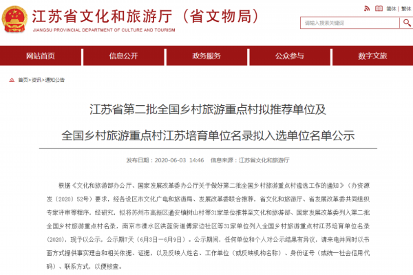 全国乡村旅游重点村江苏培育单位名录拟入选单位名单