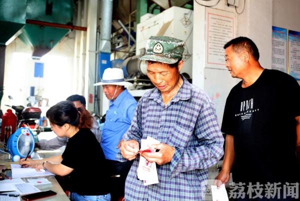 我苏网讯 6月4日,泰州兴化市千垛镇水兴村建档立卡户成余才家的9.5亩小麦收割后,直接被村里的致富能人、德志粮食专业合作社社长张德志收购,并用车辆拉到合作社烘干。接过张德志递上来的1万多元售粮款,成余才脸上露了开心的笑容。让他开心的有两个“想不到”:一是想不到产量这么高,平均亩产接近500公斤,这是他种田以来少有的高产纪录;二是每公斤价格比一般种植户高出0.2元,一亩地又多收入近百元。