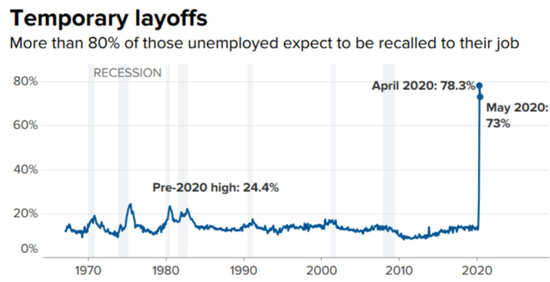 新冠疫情爆发以来,停薪留职是美国许多公司采取的削减成本的对策。统计局表示,截至5月中旬,在总共失业的2100万美国人中,有1500万人(约占73%的比重)是处于停薪留职状态