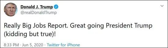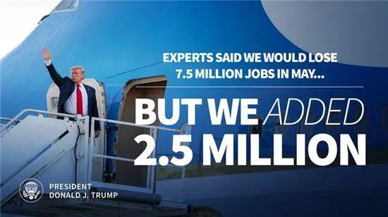 对于这份经济数据,在疫情远未得到控制之际便全力推行复工的特朗普,已经难以掩饰其喜悦之情。特朗普在推特(34.87, 1.15, 3.41%)上骄傲地表示,250万是美国历史上单月就业最大增幅:“我们是第一!”