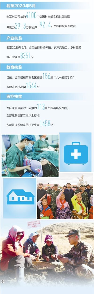 军委办公厅帮助河北涞水县福山口村发展红色文化产业、壮大集体经济;军委国防动员部在盛产大枣的河北阜平县店房村扶持建设年产20万吨的深加工厂,帮助村里40多名贫困群众在家门口就业脱贫;军委政治工作部在贵州遵义红心村扶持发展万亩脆红李种植;军委装备发展部组织官兵捐款帮助四川北川羌族自治县金龟村建起食用菌种植大棚;东部战区帮助江西井冈山市坳里乡渡陂村发展生态养殖项目,确保每个村民每年都能获得分红……