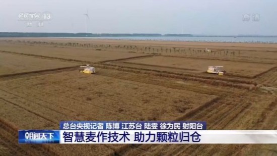 在江苏射阳,七万多亩小麦正在抢收。职业农民徐士忠今年麦收很轻松,因为在他的地块儿作业的都是安装北斗导航系统的无人收割机。