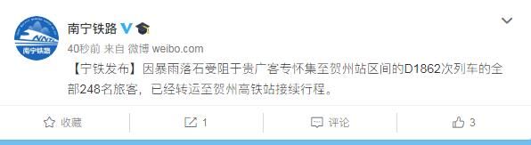荔枝新闻讯 据“南宁铁路”微博消息6月7日8时30分许,受连日强降雨影响,贵广客专怀集站至贺州站区间因落石行车受阻。当地铁路部门已启动应急预案进行抢修,造成部分列车晚点。铁路部门对因此给旅客出行带来的不便表示歉意,请旅客朋友妥善安排行程,进一步的列车运行信息将适时公告。