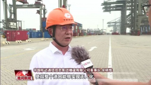 中国移动通信信息集团福建有限公司董事长 栾晓维:使得整个港口实现无人化。成本降低,安全性大大提高。这种技术将来融入百业的话,社会效益、经济效益等等这些方面都有重大意义。