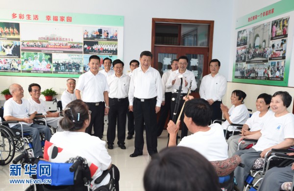 2016年7月28日,习近平总书记在河北唐山市截瘫疗养院活动室欣赏截瘫伤员表演的二胡伴唱《唱支山歌给党听》。 新华社记者 谢环驰/摄