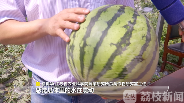 江苏省农业科学院蔬菜研究所瓜类作物研究室主任徐锦华揭秘:“外观圆整,条带清晰;卷须枯到一定程度,一般是一个成熟的西瓜了;瓜把子要弯弯的,假如它又直又粗的话,代表生长势太强了,瓜的瓤就比较硬,甜度还会降低,口感相对会差一点;畸形西瓜长得跟葫芦一样,有畸形的话容易空心,或者产生黄色的筋块,品质受影响。我们用手托起西瓜敲一敲,敲的时候如果感觉到瓜里面的水在震动,这说明瓜熟得比较好。”