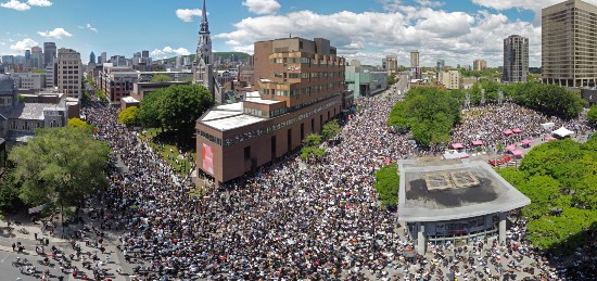 从网友在社交媒体上发布的一张全景照片看,蒙特利尔7日的游行活动与5月30日游行活动相比,吸引了更多的民众参加。