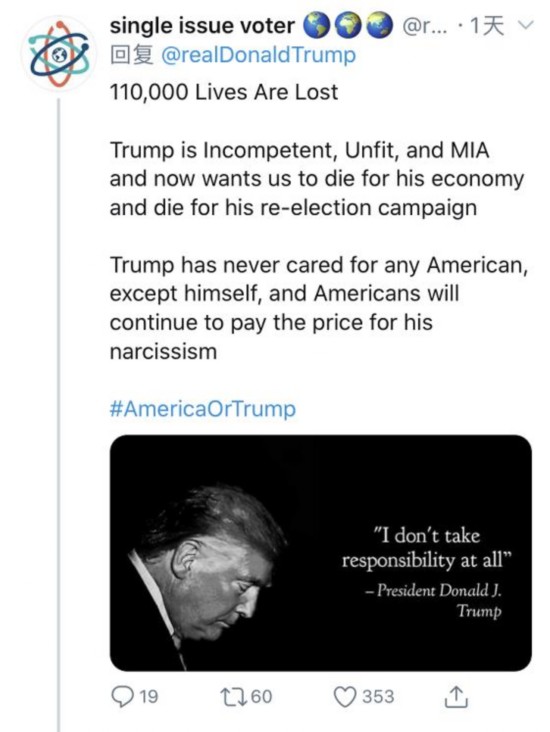 网友single issue voter指出,有11万美国人因感染新冠肺炎去世,而特朗普只关心自己任期的经济数据,关心能否在大选中连任,不顾美国人民的死活。