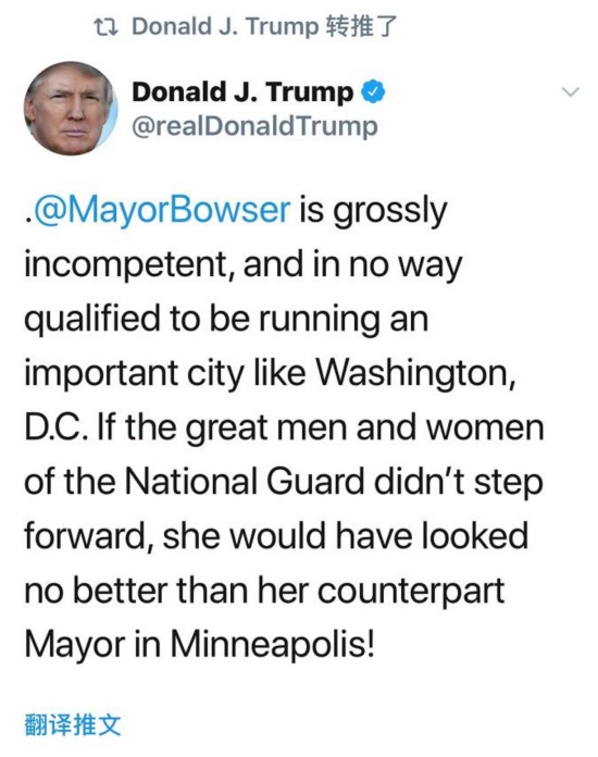面对网友的质疑,特朗普继续转发了参议员Mike Lee的推文,Mike称赞国民警卫队是冒着生命危险在对抗华盛顿特区的抗议者,而特区市长却不知感恩,将国民警卫队赶出了华盛顿特区,这种行为应该被终止。