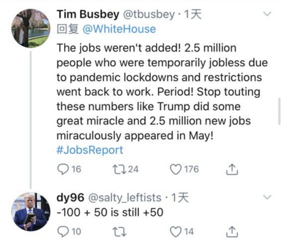 网友Tim Busbey也认为5月的就业人数并没有增加,所谓的新增250万个工作岗位只不过是之前受疫情影响,停工的人开始复工而已。