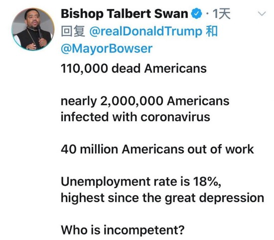 网友Bishop Taibert Swan表示,11万美国人死亡,将近200万人感染新冠病毒,4000万美国人失业,究竟谁才是无能?