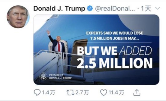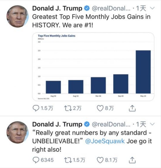 经历了新冠肺炎疫情导致的经济停摆,美国5月失业率从4月的14.7%降至13.3%,这对于特朗普来说无疑是一个喜讯。他当日曾“一键三连”,一口气连发了三条与就业相关的推文,并转发了白宫、以及一些经济学者对5月就业情况的积极评价,总统的激动心情由此可见一斑。