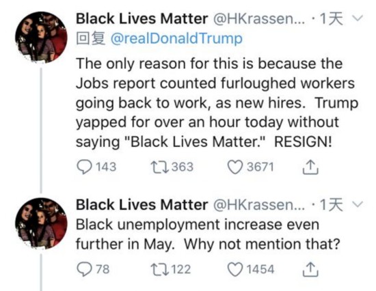 网友Black Lives Matter指出,5月的工作岗位之所以增加这么多,只不过是把之前因疫情而停工的复工者,算成了新增就业人员。另外,5月份美国非洲裔失业人口总数是增加的,但是特朗普却只字不提。