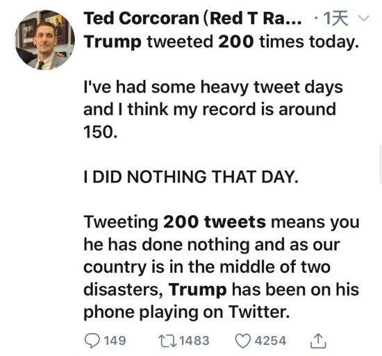 对于特朗普沉迷于发推文这件事,还有网友出来现身说法,网友Ted Cocoran说自己曾有一天除了刷推特什么事都没做,那天最多发了约150条推文。而在国家正遭受两种灾难的时候,特朗普一天内发布了200条推特,这意味着他什么也没做,就是一直在刷推特。
