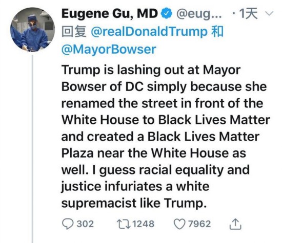 对于特朗普在推特上不断指责女市长穆里尔·鲍泽,网友Eugene Gu, MD似乎说出了真相,“特朗普之所以抨击穆里尔·鲍泽是因为她将白宫前面的路命名为‘黑人的命也是命’,并且在地上涂写了‘黑人的命也是命’,种族平等和正义激怒了特朗普这个白人至上主义者。”
