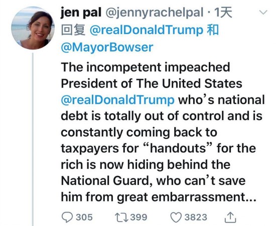 网友Jen pal认为真正无能的是特朗普,国债无法偿还,持续不断地向纳税人收税,有钱人现在正躲在国民警卫队身后。