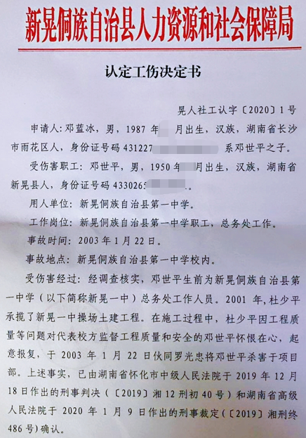 据红星新闻此前报道,2020年1月3日,周兆成和家属将《新晃侗族自治县工伤认定申请表》《律师代理意见》以及相关证据材料递交给被害人邓世平生前所在单位——新晃县第一中学。1月7日,新晃县第一中学代为向新晃侗族自治县人力资源和社会保障局(以下简称:新晃侗族自治县人社局)提起邓世平工伤(工亡)申请。