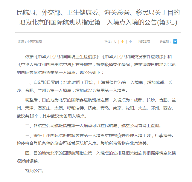 民航局、外交部、卫生健康委、海关总署、移民局关于目的地为北京的国际航班从指定第一入境点入境的公告(第3号)