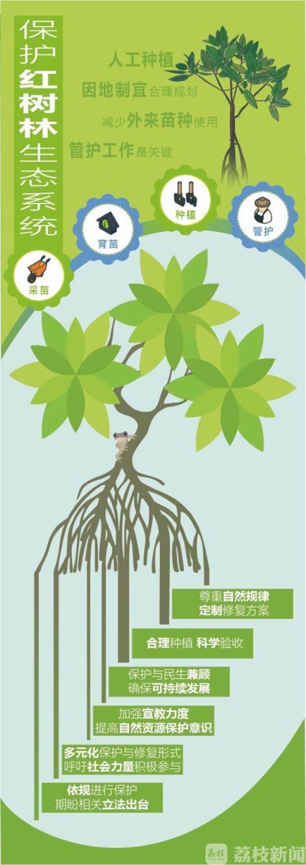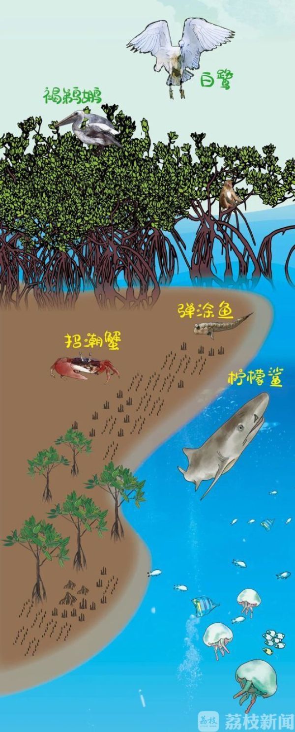 然而,在保护与修复红树林的过程中,也要因地制宜,综合考虑生态系统中其它生物的生存环境,定制生态修复方案。