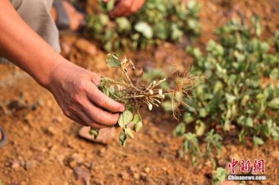 资料图:2014年8月4日,河南嵩县黄庄乡付沟村,因为干旱地里的花生没能结出任何果实。 中新社王中举 摄