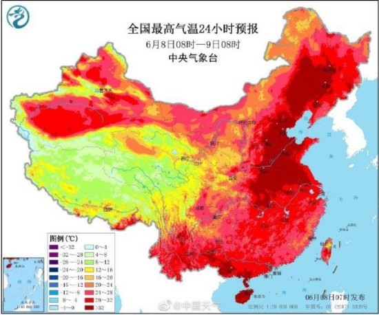 全国最高气温24小时预报(6月8日08时-9日08时) 来源:中央气象台