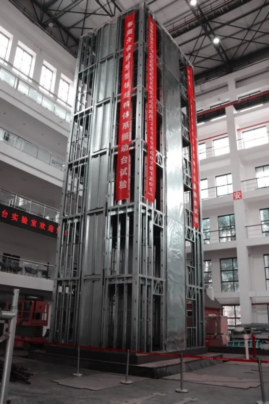 重庆大学振动台实验室净高25.5米,台面尺寸6.1米×6.1米、载重量60吨,可3向6自由度输入地震,是国内台面尺寸、载重量和抗倾覆力矩最大的振动台之一。他们这次在振动台上搭建起了6层足尺寸实体冷弯薄壁型钢结构房屋,总高16.2米,长5.6米,宽4.2米。采用了钢管端柱—双面蒙皮钢板剪力墙和夹支单层薄钢板剪力墙两种新型抗侧力体系。与国内外已经完成的冷弯薄壁型钢结构的振动台试验对比,本次冷弯薄壁型钢结构振动台试验具有结构体系新、结构高宽比大、加载工况烈度高达8度罕遇状况、分施工阶段和正常使用两个阶段测试等一系列特点。