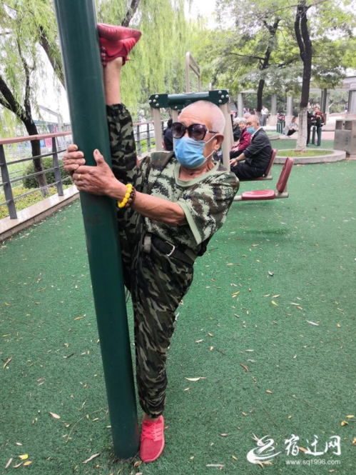 宿迁市区河滨公园是市民晨练的好地方,每天早上都聚集了几百名锻炼的市民。其中,有一位老人特别惹眼。他锻炼的动作难度很大:能一口气翻单杠上百个、“一字马”压腿半小时、抓住吊环荡秋千、腹肌轮一次做10多个、仅仅依靠双臂爬绳能上下五六次……