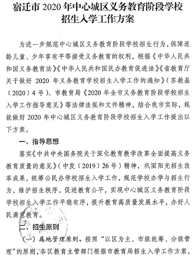 6月8日,记者从宿迁市教育局了解到,为进一步规范中心城区义务教育阶段学校招生行为,保障适龄儿童、少年享有平等接受义务教育的权利,《宿迁市2020年中心城区义务教育阶段学校招生入学工作方案》正式发布,明确了2020年宿迁义务教育招生入学的招生原则、招生计划、招生办法、报名时间等。